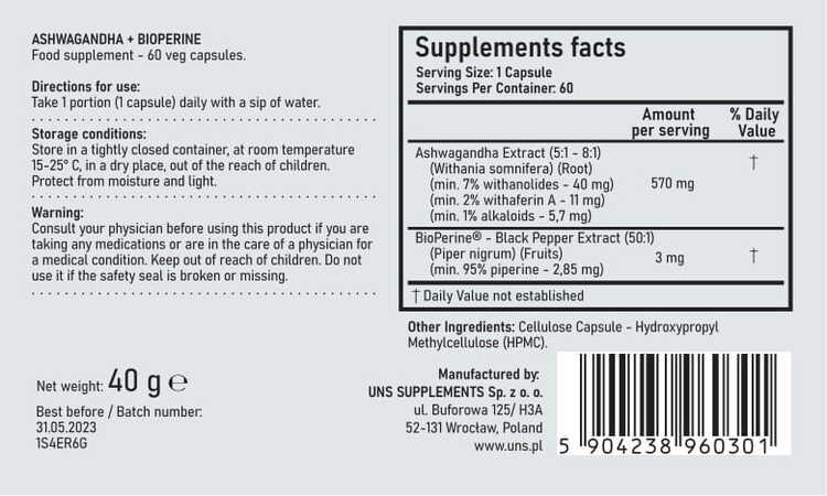 UNS Ashwagandha + Bioperine 60 caps to silny adaptogen. Suplement zawiera 570 mg ekstraktu z witanii ospałej (zwanej ashwagandhą) standaryzowany na 7% witanolidów, 2% witaferyny A, 1% alkaloidów, 95% piperyny . Wzbogacony o ekstrakt z pieprzu czarnego w ilości 3 mg. UNS Ashwagandha + Bioperine 60 caps posiada informację o DER - Drug Extract Ratio, co daje informacje nt. stężenia otrzymanej substancji w stosunku do suszu. Preparat Ashwagandha + Bioperine zawiera ekstrakt 5:1 - 8:1 z korzenia witanii ospałej oraz ekstrakt 50:1 z owoców pieprzu czarnego. Preparat nie zawiera żadnych sztucznych wypełniaczy, barwników konserwantów. Wyłącznie oparty na naturalnych ekstraktach.