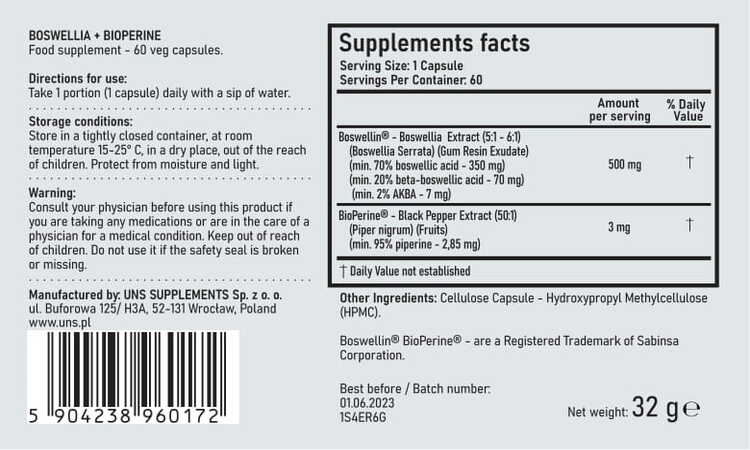 - UNS supplements Boswellia + Bioperine 60 caps suplement przeciwzapalny