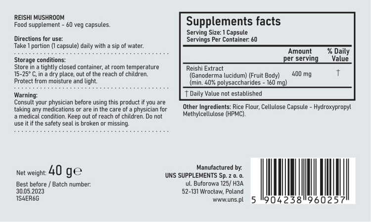 UNS Reishi Mushroom to silny adaptogen z grupy suplementów diety, w skład którego wchodzi najwyższej jakości ekstrakt z grzybów Reishi standaryzowany na wysoką zawartość polisacharydów i triterpenów.